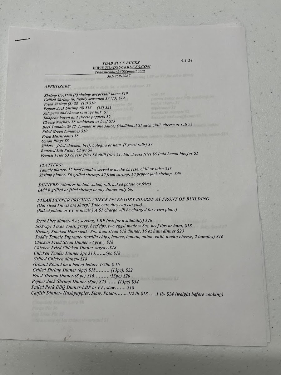 Toad Suck Bucks offers a straightforward and inviting menu that feels at home in its rustic, laid-back setting. The focus is on familiar American fare with a steakhouse touch, featuring hearty, comforting dishes that suit relaxed lunches, casual dinners, or weekend gatherings with family and friends.